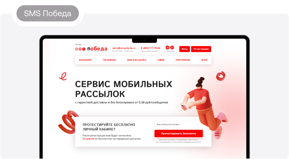 5. SMS Победа. Стоимость сообщения — от 38 копеек. Доступна отправка через мессенджеры. Сервис гарантирует защиту базы контактов. Рассылку можно делать по собственным или таргет-базам номеров. Предусмотрена опция «Турбо-SMS» с возможностью создания простого сайта, на который ведет ссылка из текста. SMS Победа предлагает сегментирование базы, функцию ее проверки с удалением устаревших и неактивных абонентов. Попробовать сервис можно бесплатно — после регистрации клиент получит бонусные 50 рублей.