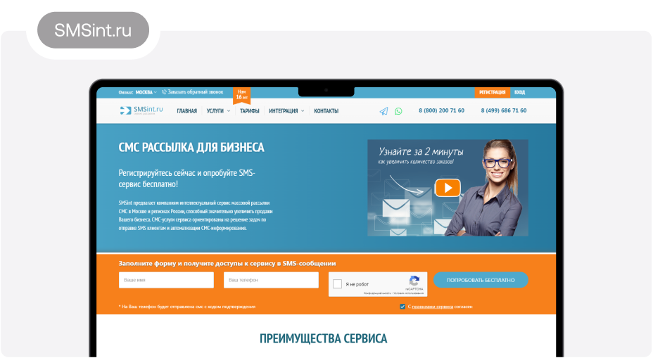 9. SMSint.ru Платформа открылась в 2009 году. Сегодня она предлагает рассылки SMS, отправку сообщений в мессенджерах и другие услуги. Минимальная стоимость SMS — 39 копеек. Предусмотрен бесплатный пробный период, опции фильтрации абонентов, создания шаблонов. Платить за указание имени отправителя не нужно, как и за интеграцию с популярными CRM-системами. Пополнять баланс можно на любую сумму, а скорость отправки сообщений составляет от 6000 в минуту.
