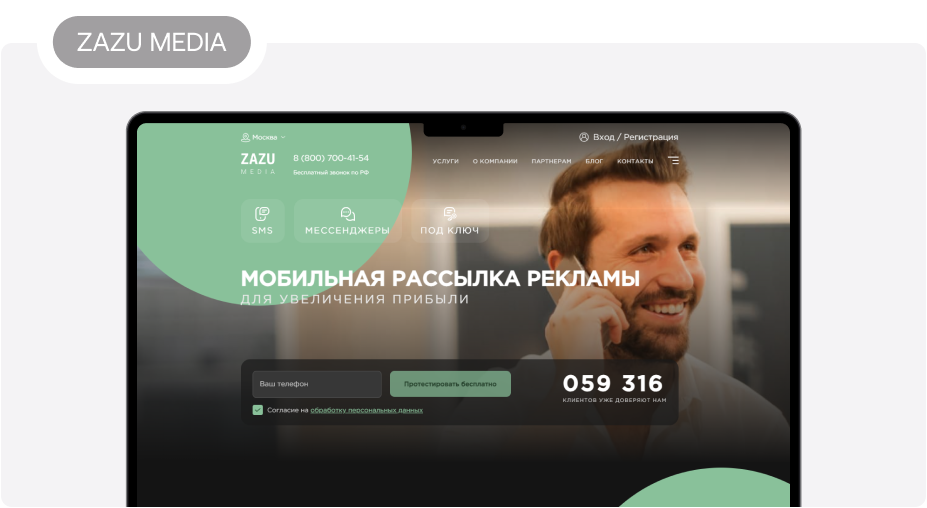 3. ZAZU MEDIA — платформа рассылки по SMS и в мессенджерах. Цена сообщения — от 59 копеек. Протестировать функционал сервиса можно бесплатно: после регистрации клиенту начислят бонусные 50 рублей. Запускать рассылку можно через мобильную или десктоп-версию. Предусмотрена возможность отправки сообщений под ключ: специалисты возьмут на себя подготовку текста, подбор и проверку базы номеров и другие задачи. Также доступна опция «Турбо-SMS» для увеличения конверсии. Можно за несколько минут сконструировать мини-сайт для приема заявок и дать ссылку на него в сообщении.