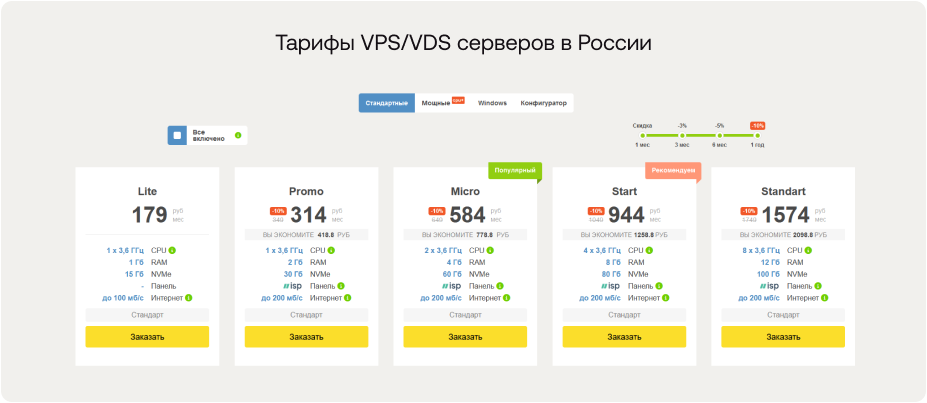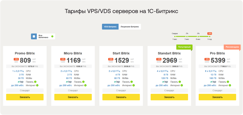 Кроме того, важно, на каком движке работает ваш сайт, так как разные CMS потребляют разное количество ресурсов. Например, если ваш проект построен на «Битриксе», то лучше сразу смотреть в сторону VDS под «1С-Битрикс» с быстрыми NVMe-дисками, так как «Битрикс» — довольно требовательная платформа. Особенности и стоимость таких виртуальных серверов и их конфигурацию вы можете узнать по ссылке.